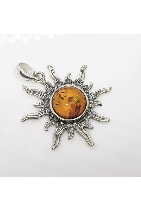 Pendentif en ambre soleil. Pendentif en ambre cognac et argent 925/1000 en forme de soleil.